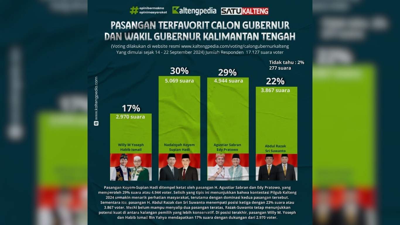 Pasangan Koyem-Supian Hadi ditempel ketat oleh pasangan H. Agustiar Sabran dan Edy Pratowo, yang memperoleh 29% suara atau 4.944 voter. Selisih yang tipis ini menunjukkan bahwa kontestasi Pilgub Kalteng 2024 semakin menarik perhatian masyarakat, terutama dengan dominasi kedua pasangan tersebut.