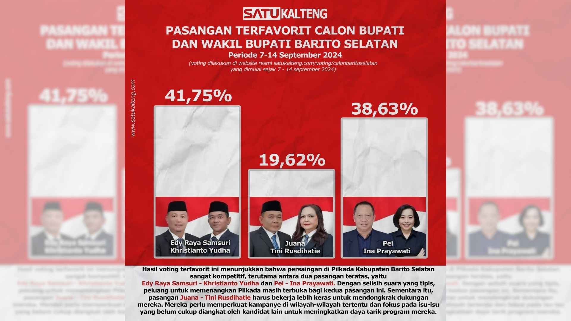 SATUKALTENG, Buntok – Voting terfavorit pasangan calon Bupati dan Wakil Bupati Barito Selatan yang digelar oleh Satu Kalteng selama 7 hari, dari 7 hingga 14 September 2024, telah ditutup dan menghasilkan peta dukungan yang cukup ketat di antara kandidat. Berdasarkan hasil voting yang diikuti oleh 2.000 suara, pasangan Edy Raya Samsuri – Khristianto Yudha berhasil memimpin di posisi teratas, diikuti secara ketat oleh Pei – Ina Prayawati, sementara Juana Tini Rusdihatie menempati posisi terakhir.