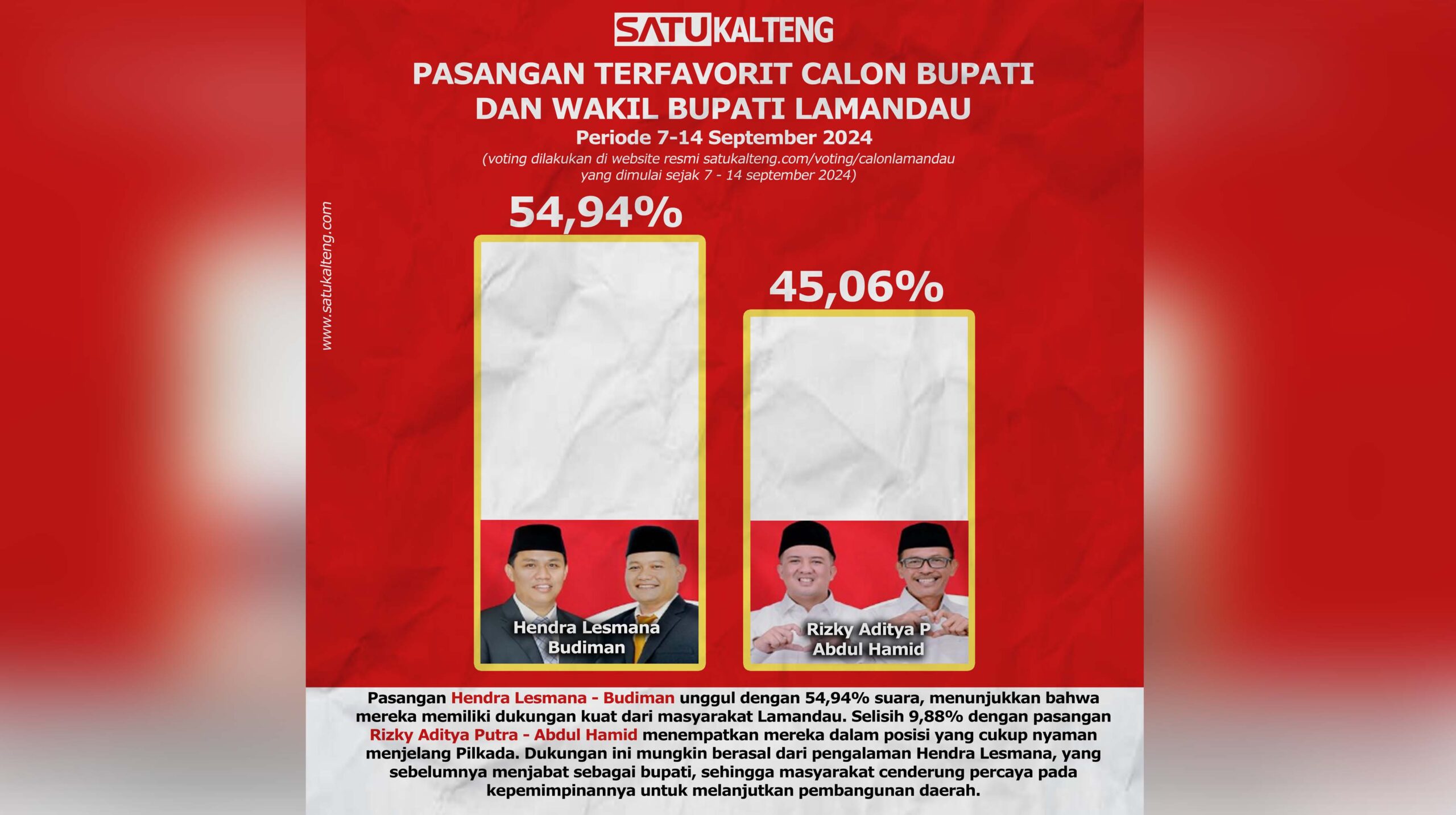 Hasil Voting Terfavorit Calon Bupati dan Wakil Bupati Lamandau Periode 7-14 September 2024 versi Satu Kalteng