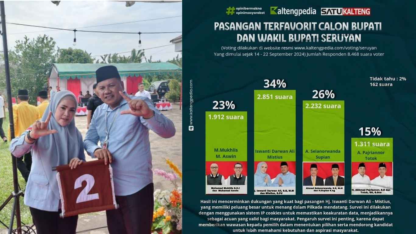 SATUKALTENG, Seruyan – Kaltengpedia telah merilis hasil survei terbaru mengenai pasangan calon Bupati dan Wakil Bupati Seruyan untuk Pilkada 2024. Survei yang berlangsung dari tanggal 14 hingga 22 September 2024 menunjukkan bahwa pasangan Hj. Iswanti Darwan Ali dan Mistius mendominasi dengan perolehan 2.851 suara atau 34% dari total responden.