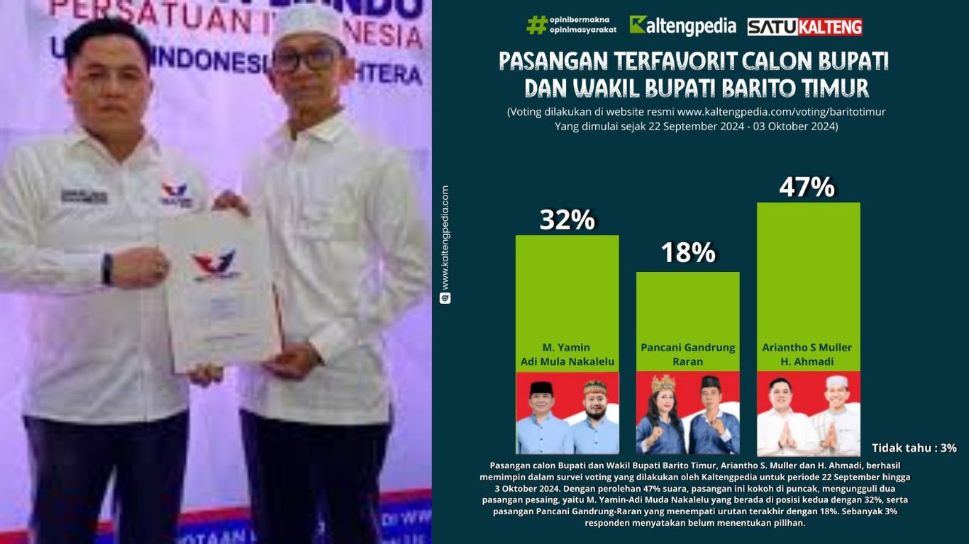 SATUKALTENG, Tamiang Layang – Pasangan calon Bupati dan Wakil Bupati Barito Timur, Ariantho S. Muller dan H. Ahmadi, berhasil memimpin dalam survei voting yang dilakukan oleh Kaltengpedia untuk periode 22 September hingga 3 Oktober 2024. Dengan perolehan 47% suara, pasangan ini kokoh di puncak, mengungguli dua pasangan pesaing, yaitu M. Yamin-Adi Muda Nakalelu yang berada di posisi kedua dengan 32%, serta pasangan Pancani Gandrung-Raran yang menempati urutan terakhir dengan 18%. Sebanyak 3% responden menyatakan belum menentukan pilihan.