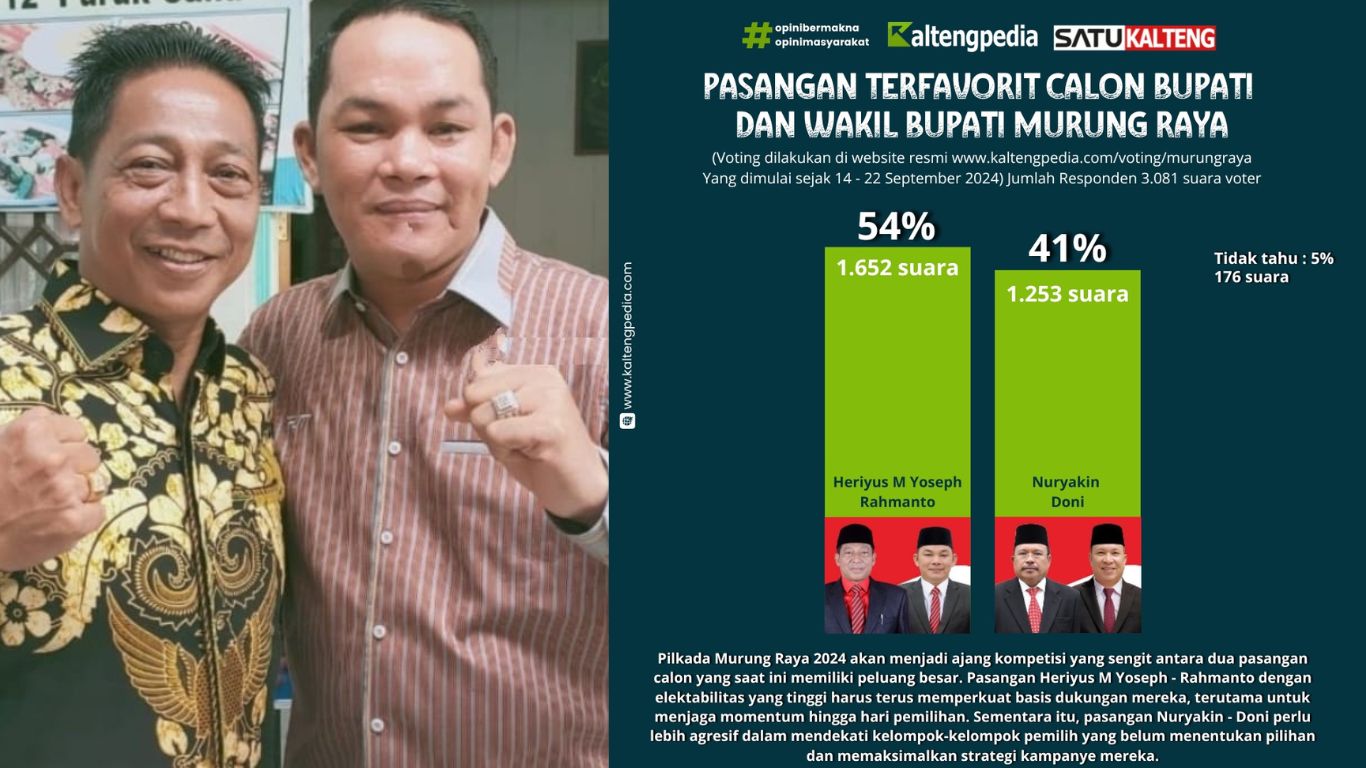 SATUKALTENG, Puruk Cahu – Kaltengpedia merilis hasil survei terbaru terkait pasangan calon Bupati dan Wakil Bupati Murung Raya periode 14 hingga 22 September 2024. Berdasarkan survei ini, pasangan Heriyus M Yoseph – Rahmanto memimpin perolehan suara dengan 54% atau 1.652 voter, sementara pasangan Nuryakin – Doni menyusul dengan 41% atau 1.253 voter. Tercatat sebanyak 5% atau 176 voter masih belum menentukan pilihan (tidak tahu).