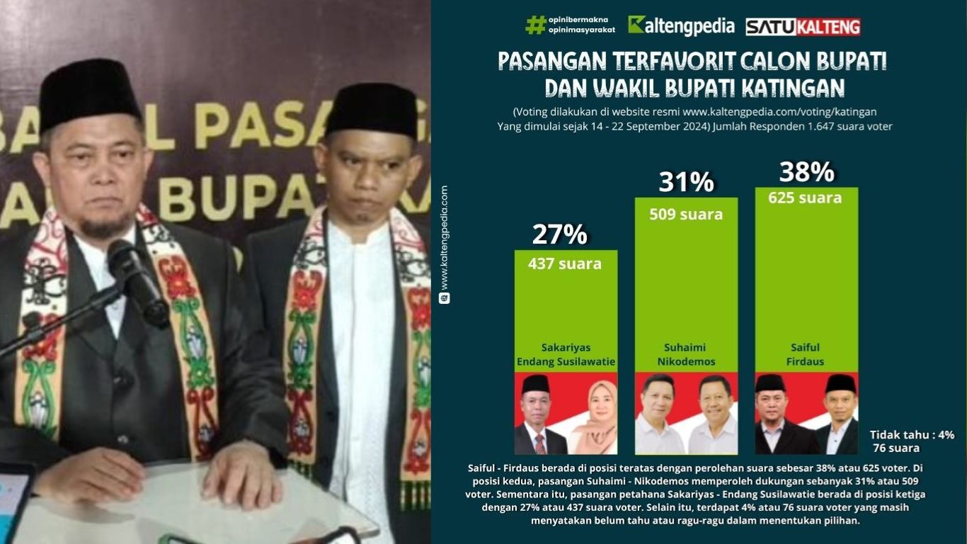 Dengan hasil survei yang dirilis oleh Kaltengpedia, pasangan Saiful – Firdaus saat ini memiliki peluang besar untuk meraih kemenangan dalam Pilkada Katingan 2024. Dukungan kuat sebesar 38% memberikan mereka keunggulan yang signifikan atas pesaing terdekat. Namun, pasangan Suhaimi – Nikodemos yang meraih 31% dukungan menunjukkan bahwa persaingan masih sangat terbuka, dan mereka tetap menjadi penantang serius. Sementara itu, pasangan Sakariyas – Endang dengan 27% dukungan perlu memperkuat basis suara mereka untuk kembali bersaing.