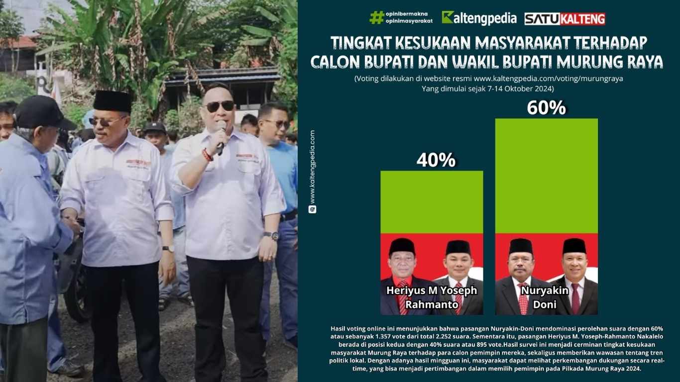 “Hasil voting online ini menunjukkan bahwa pasangan Nuryakin-Doni mendominasi perolehan suara dengan 60% atau sebanyak 1.357 vote dari total 2.252 suara. Sementara itu, pasangan Heriyus M. Yoseph-Rahmanto Nakalelo berada di posisi kedua dengan 40% suara atau 895 vote,” kata CEO Kaltengpedia, Ahmad Hady Surya, Rabu (16/10/2024).